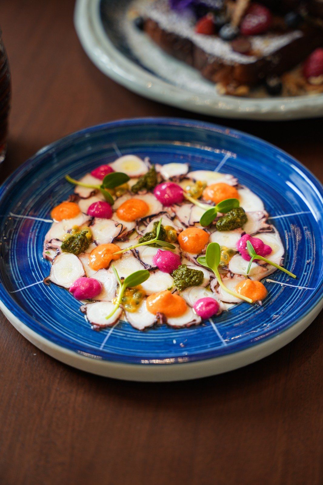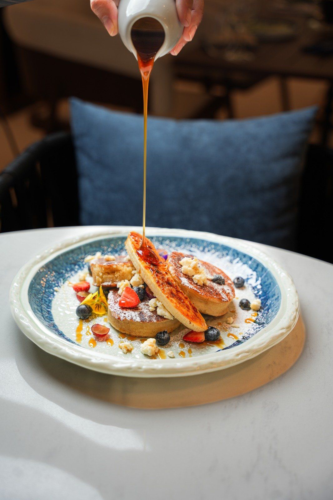 Buttered tsoureki brioche bread, fresh blue berry, honey, walnuts & icing sugar